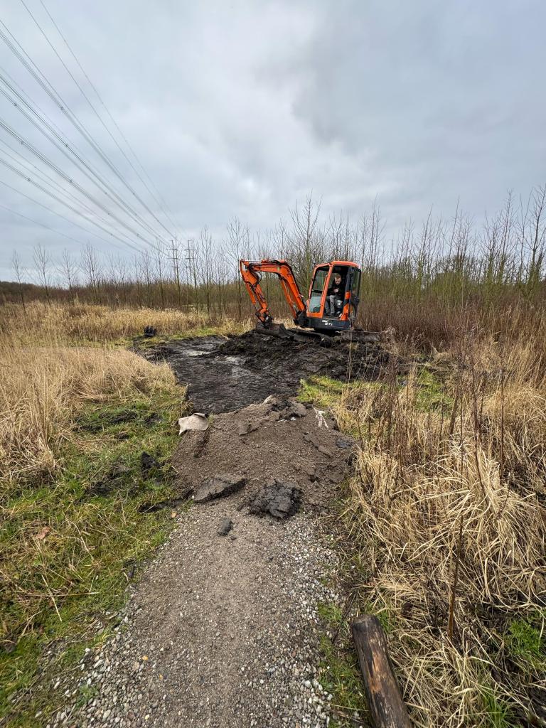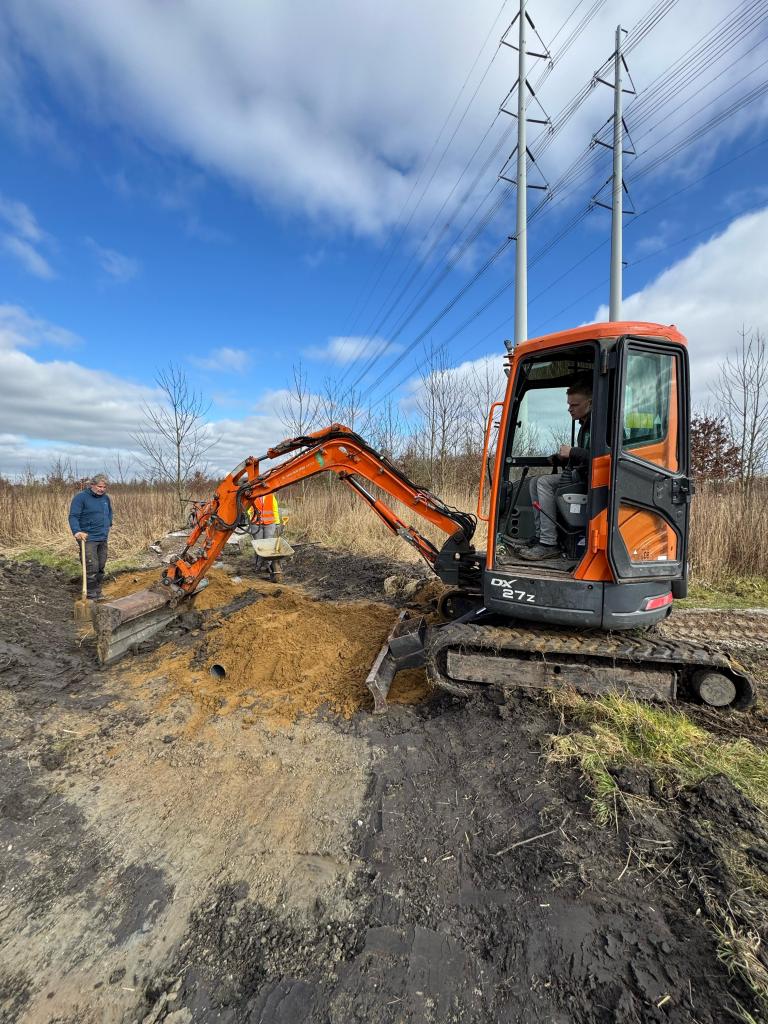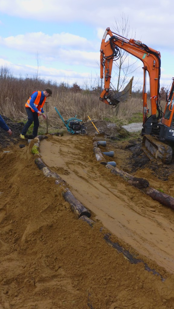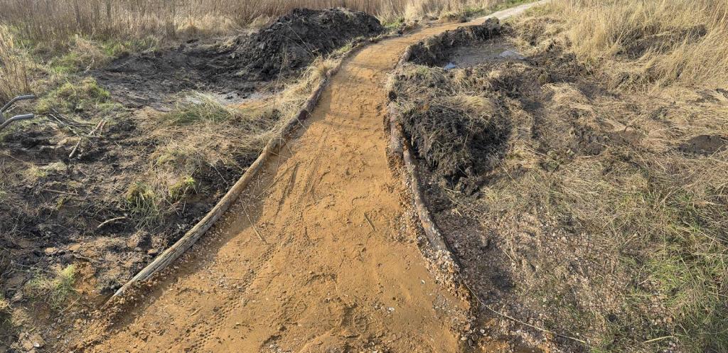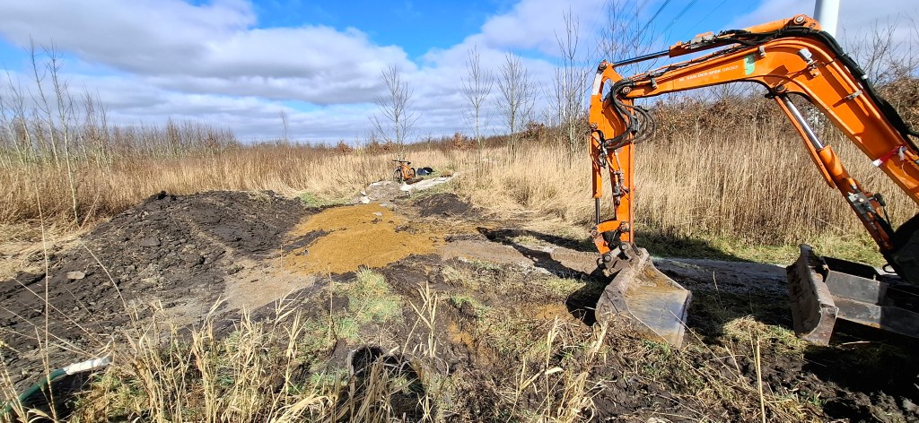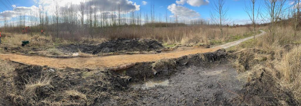 Vlak voor start en finish van het parcours is het laagste punt. We hebben gemerkt dat na een paar flinke buien het daar dusdanig vol kan lopen dat fietsen geen optie meer is en zwemmen wel.. Gisteren hebben we daarom de route daar volledig opnieuw aangelegd, maar dan zo dat het water voortaan onder het pad door kan en aan weerszijden wordt opgevangen in waterbekkens. Het pad loopt daar nu hoger en in een bocht tussendoor.