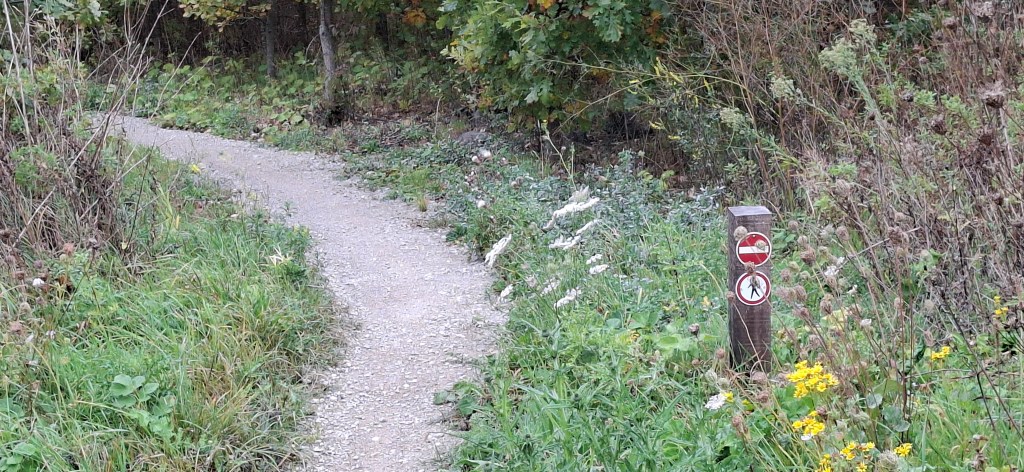 We komen helaas nog al eens wat (al dan niet rennende) wandelaars tegen op de route. In het hele Bentwoud mag je dan ook vrij wandelen en struinen, behalve.. bij de MTB route. Er is lang en zorgvuldig gezocht naar een plek waarbij geen paden gekruist worden en je elkaar zo niet in de weg zit. En net zo goed als dat het vervelend is als er fietsers op de voetpaden zitten, is dat andersom ook zo. En bovendien.. het is gewoon gevaarlijk. Ons parcours zit vol met blinde bochten en als je dan opeens een wandelaar met of zonder hond tegenkomt… En daarbij lopen de wandelaars ook nog al eens aan de randen op de bultjes die daardoor afbrokkelen.